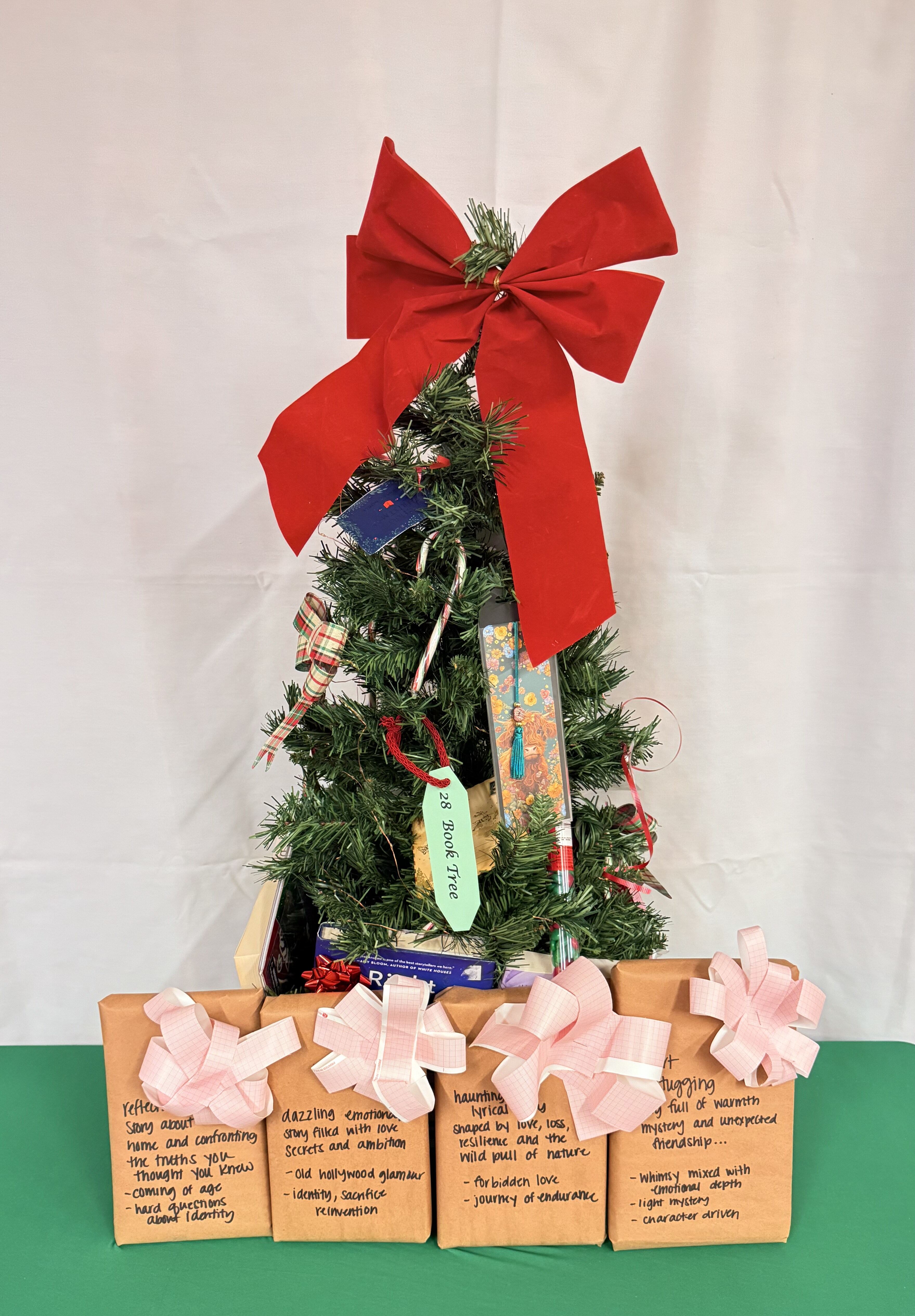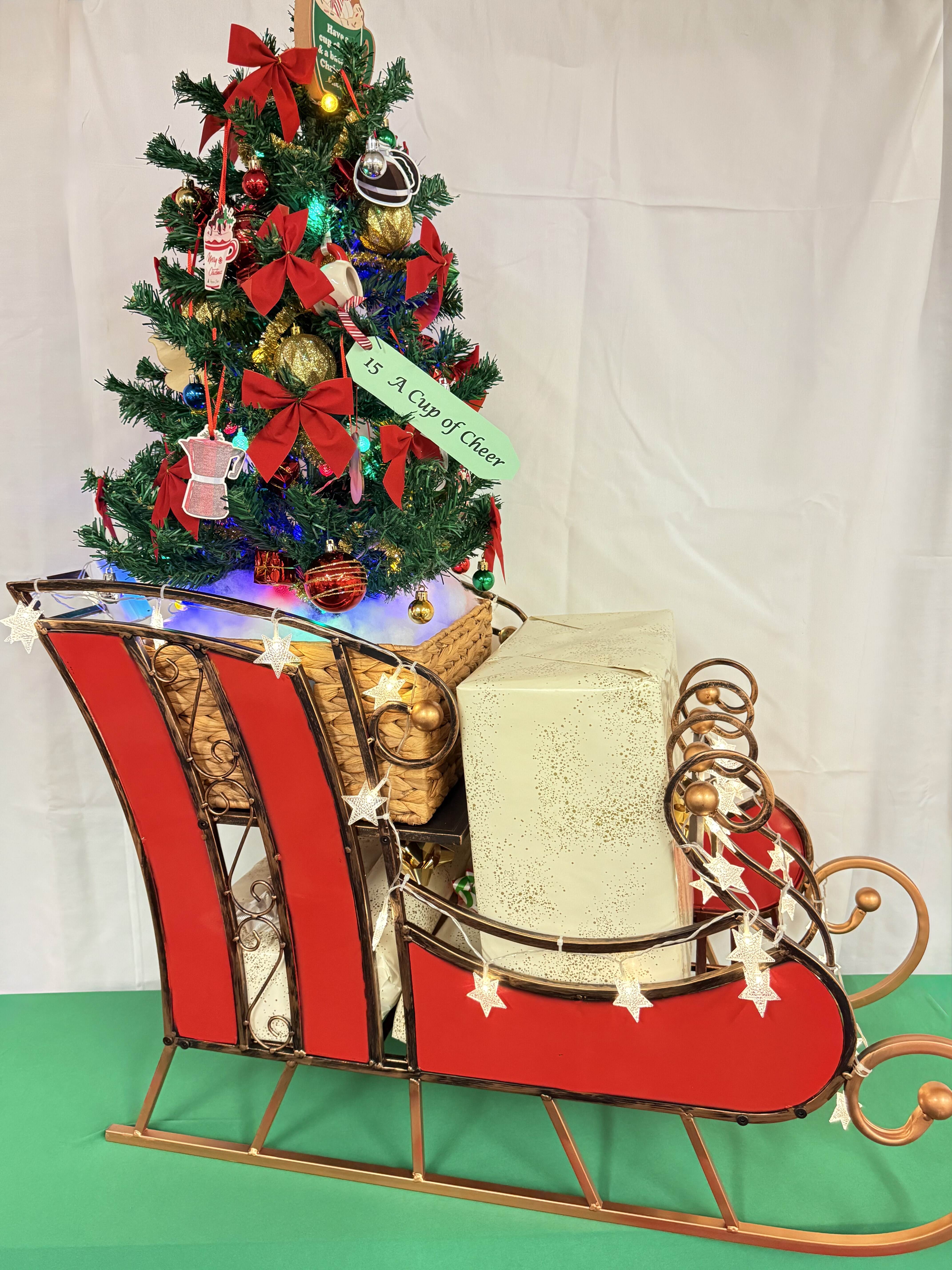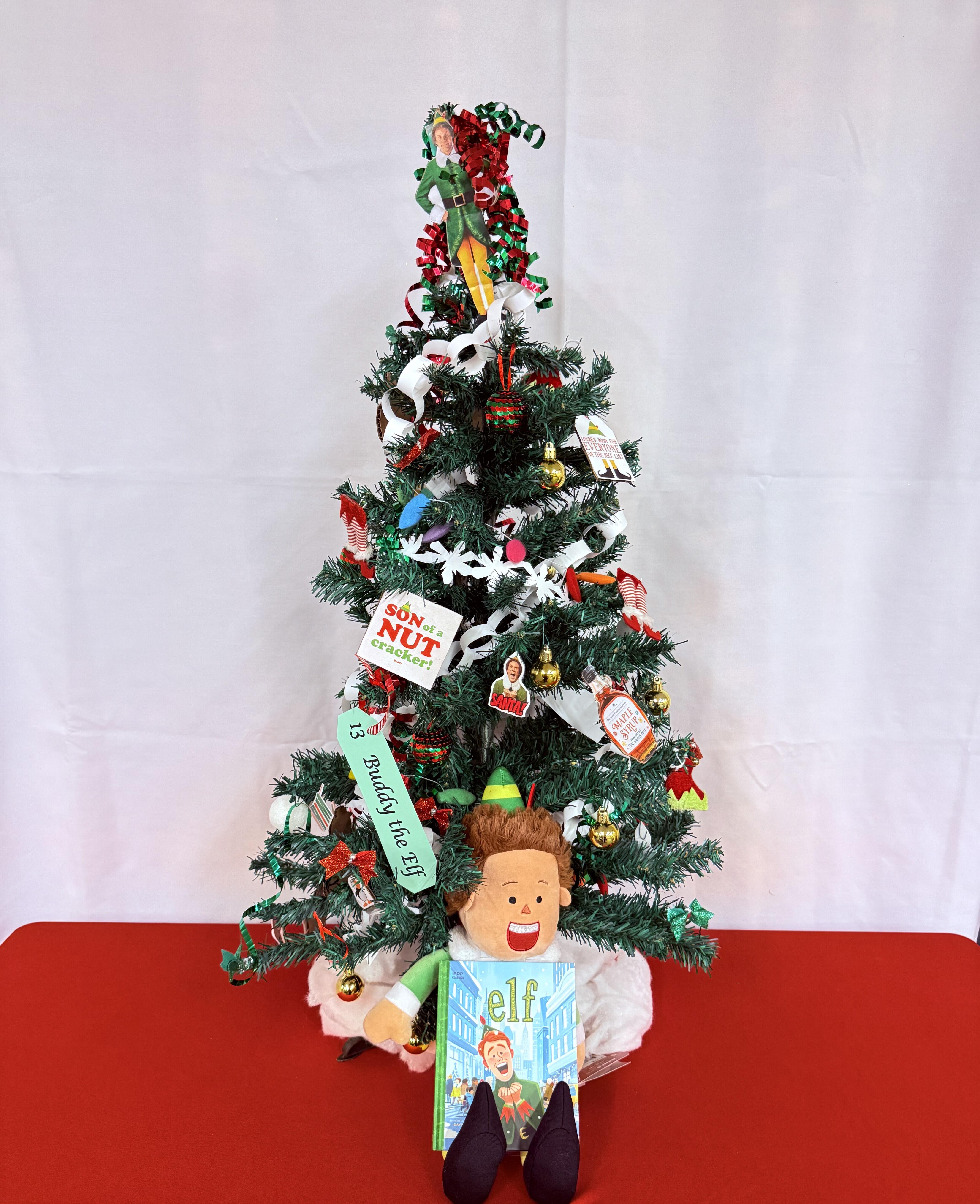 Tree contains Buddy and his friend’s ornaments. Buddy’s story book – Elf, Buddy the Elf stuffed toy.