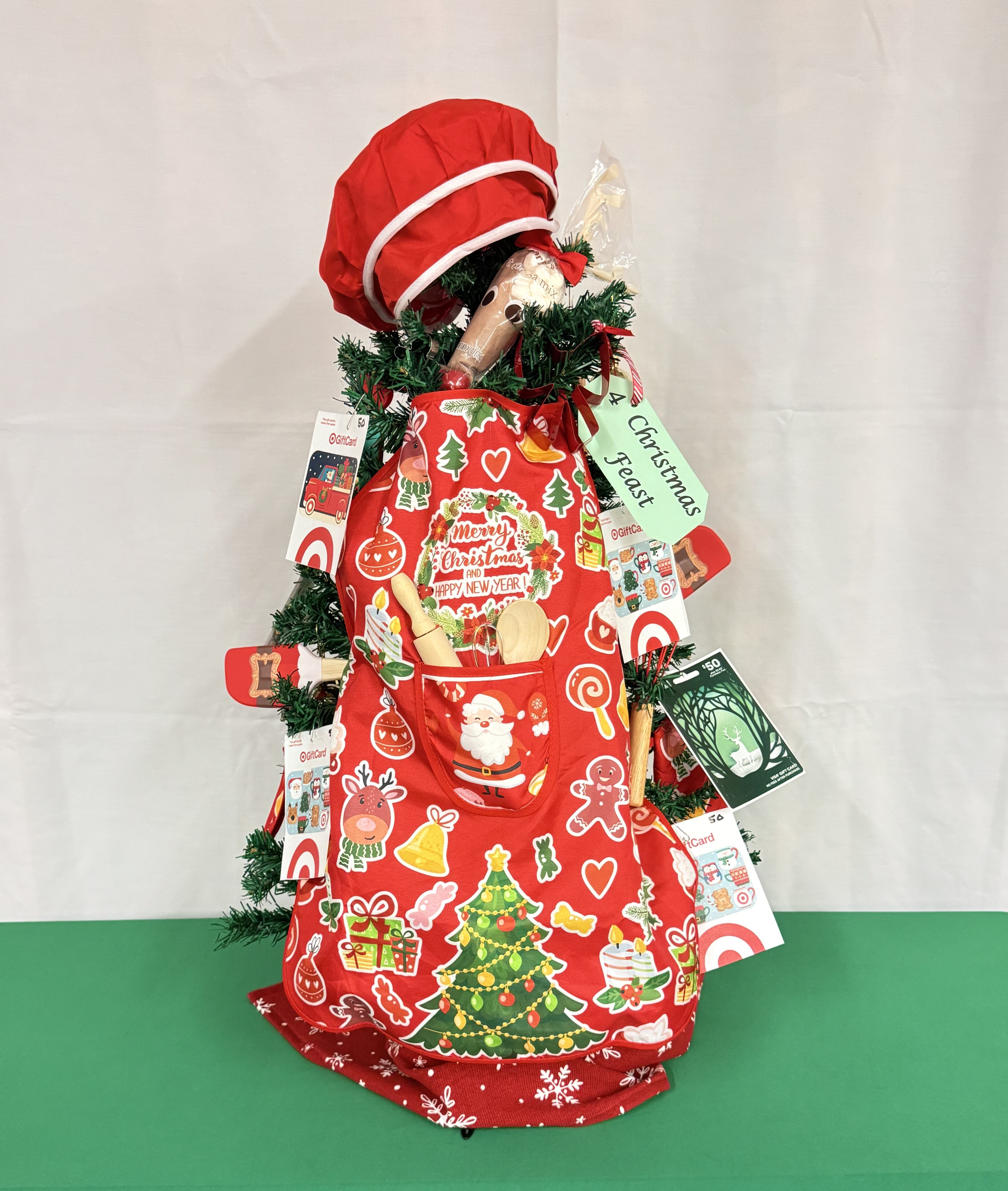 Tree decorated with novelty bakery items and $200 in Target gift cards and $100 in Visa gift cards to create your own feast.