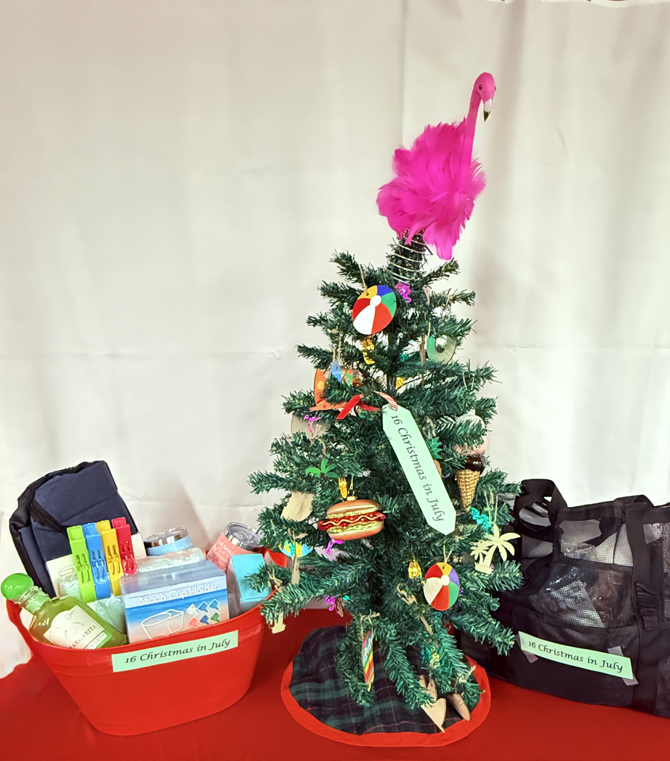 Includes: Summer themed ornaments, beach bag, backpack cooler, insulated cups, cocktail mixers, beach cup holders, Turkish towels, towel chair clips, waterproof phone holder, portable speaker, beach games, flamingo tree topper, and a UV rechargeable light string.