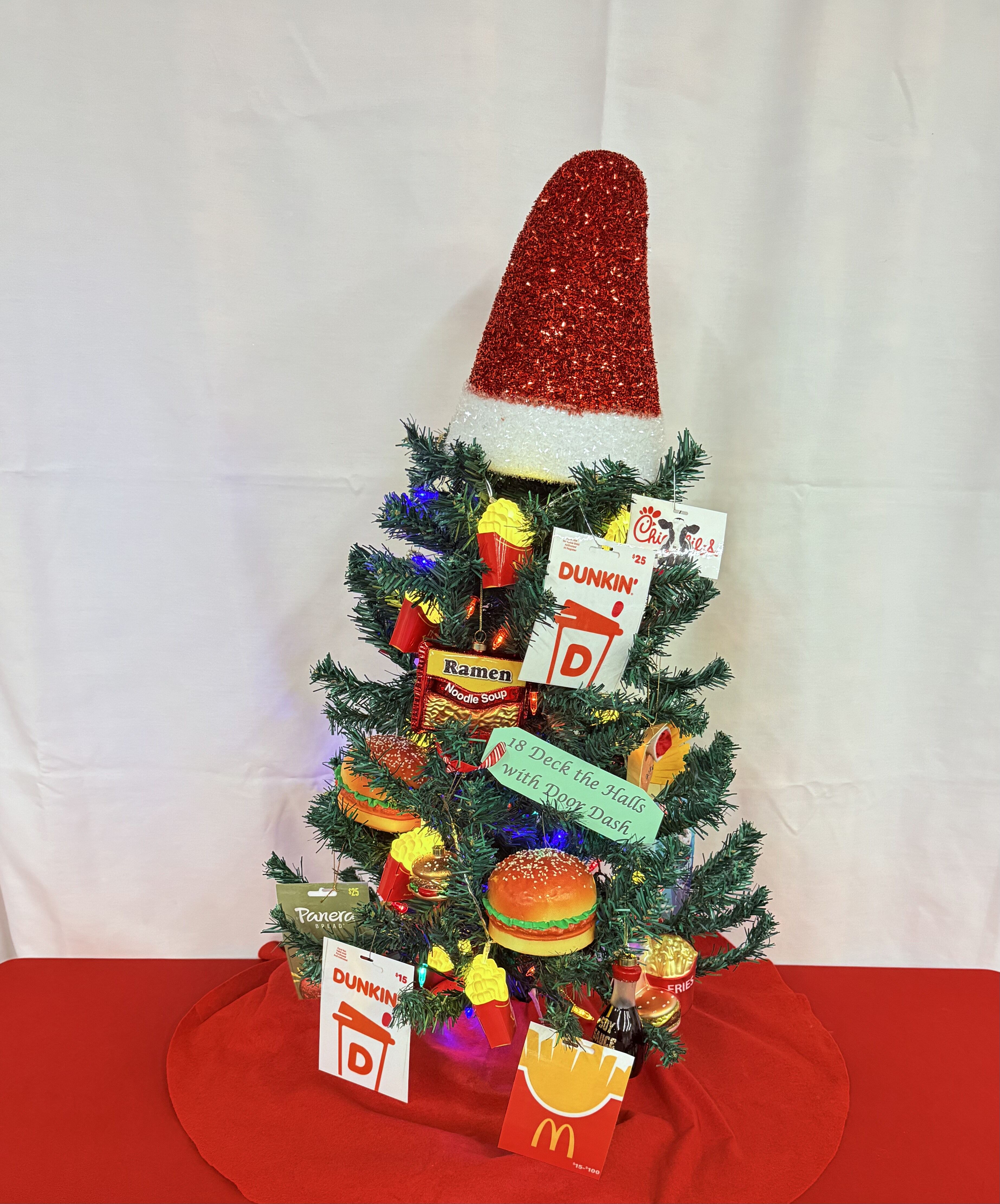 $230 in fast food gift cards, food ornaments, and french fry lights.