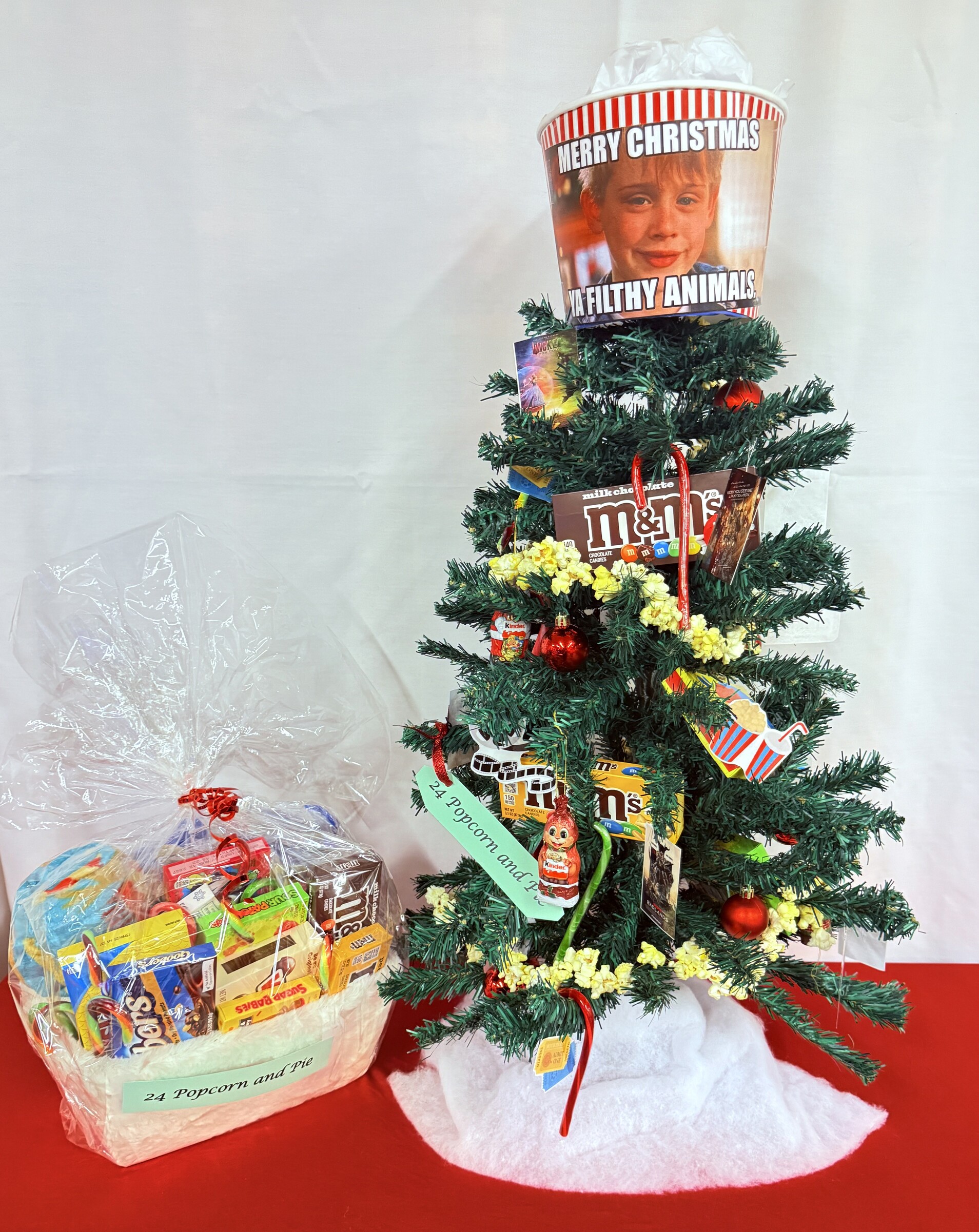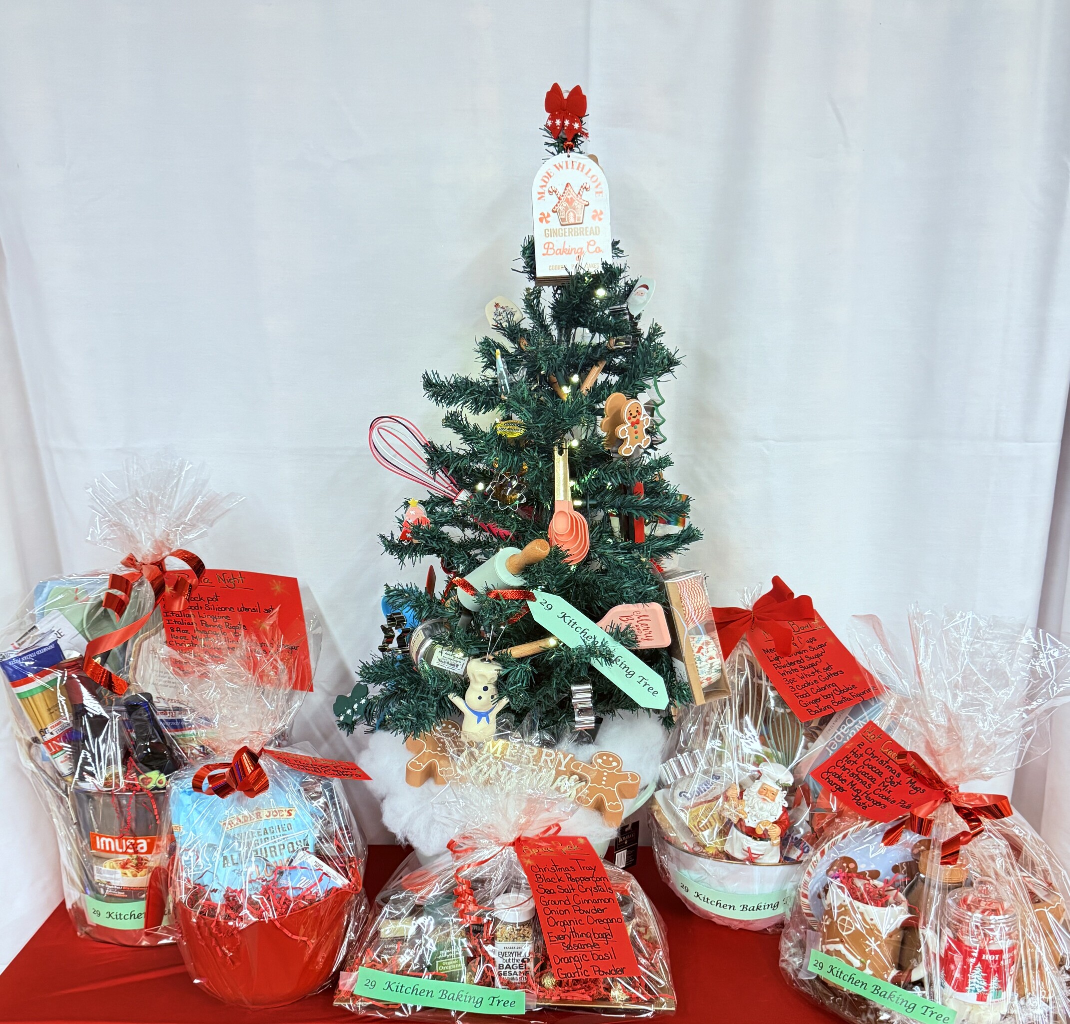 Tree decorated with baking items. Spice Rack Christmas tray with black peppercorn, sea salt crystals, ground cinnamon, onion powder, organic oregano, everything bagel sesame, organic basil, garlic powder. Pasta Night basket includes stock pot, wood and silicone utensil set, Italian linguine, Italian penne Avocado oil, balsamic vinegar, towel set, mittens, hand can opener, woven trivets. Mixing Bowl basket, measuring cups, brown sugar, powdered sugar, white sugar whisk set, cookie cutters, food coloring. Mixing Bowl, flower, cookie cutters, whipping cream. Hot Cocoa Tray contains 2 Christmas mugs, hot cocoa set, cocoa mix, cookie plate, mug hangers, Charger.