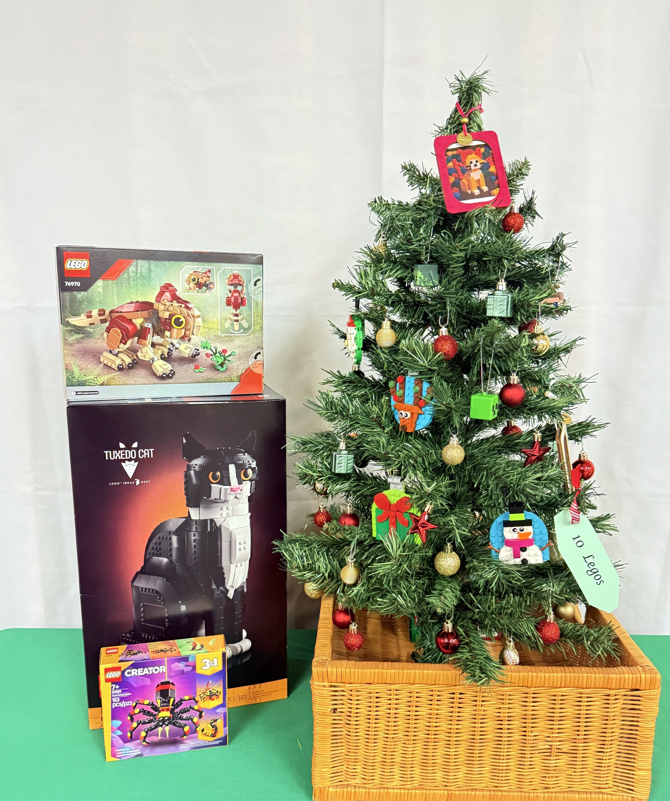 Lego themed tree containing Lego Tuxedo cat, Christmas ornaments, 3 in 1 creator surprising spider, Jurassic park baby dinosaur.