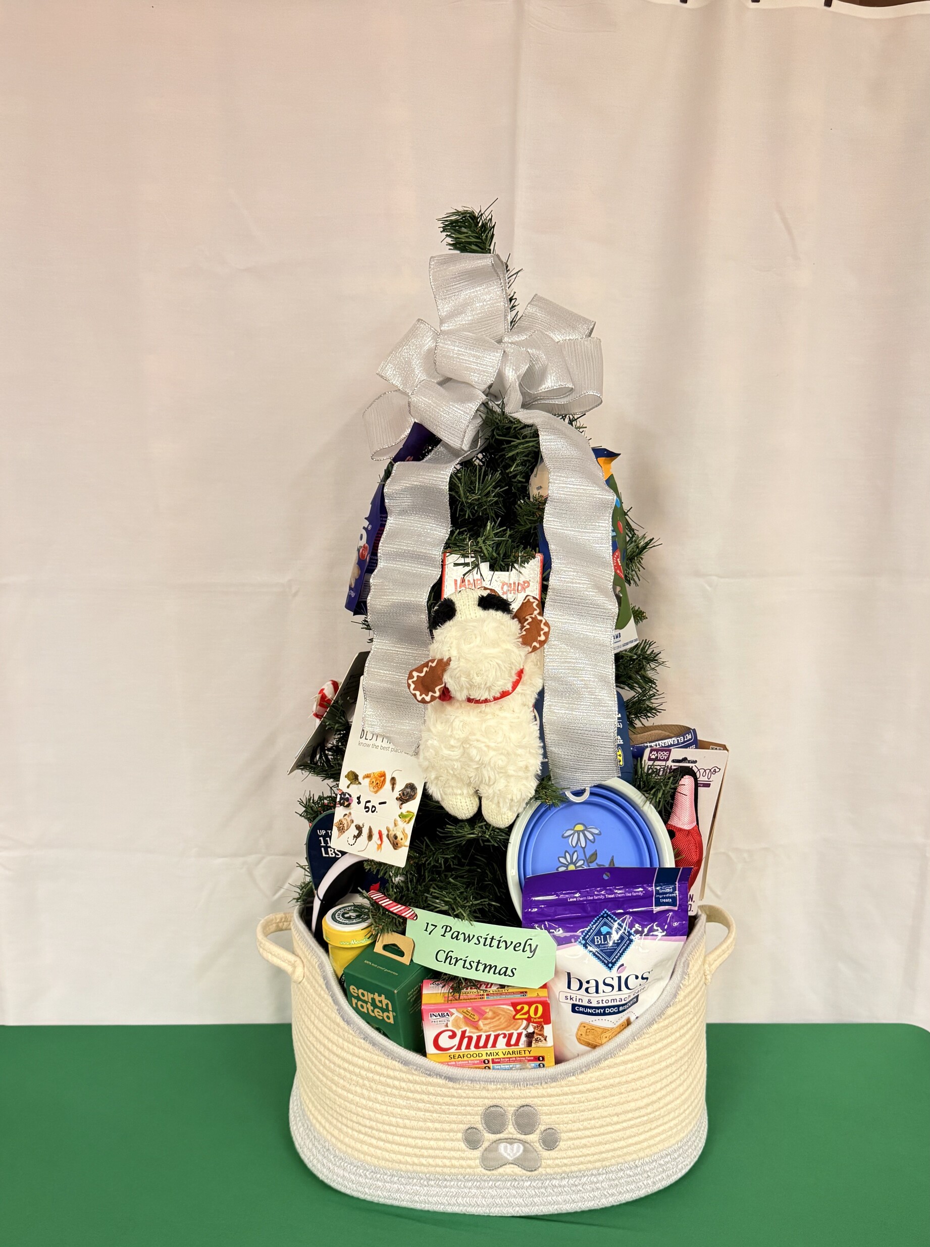 Pet mat, wipes, grooming brush, shampoo, T-shirt, dog and cat treats, travel bowel, dog and cat toys, cat nip, poop bags and dispenser, cat litter scooper, dog leash, lint brush, basket and $50 gift card for Petco!