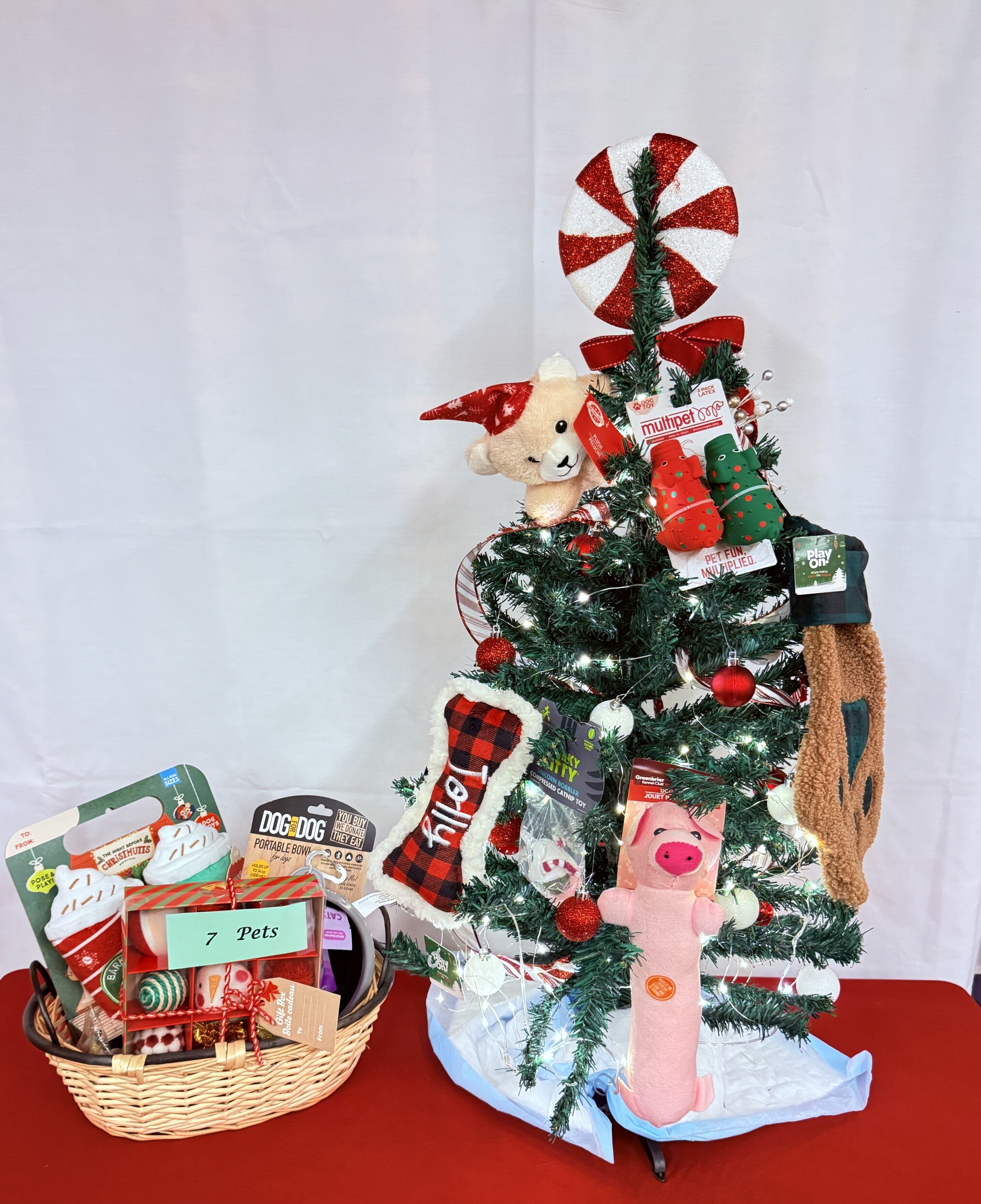 Pet basket filled with both dog and cat items, both practical and fun!