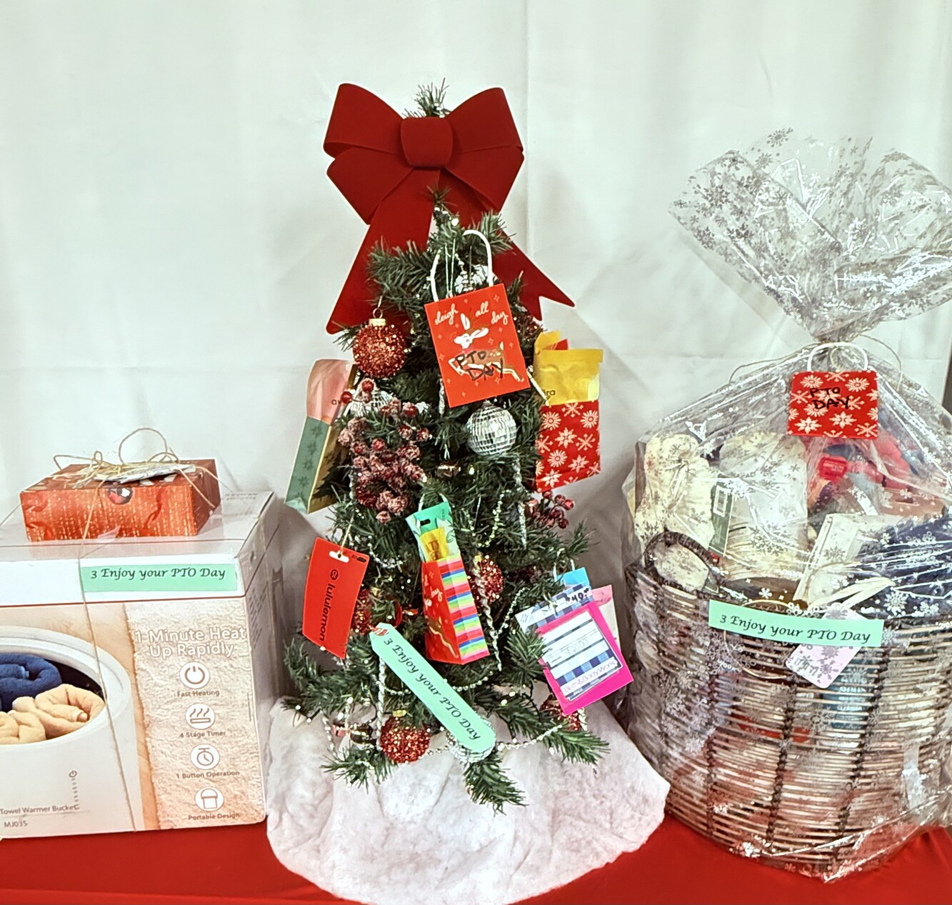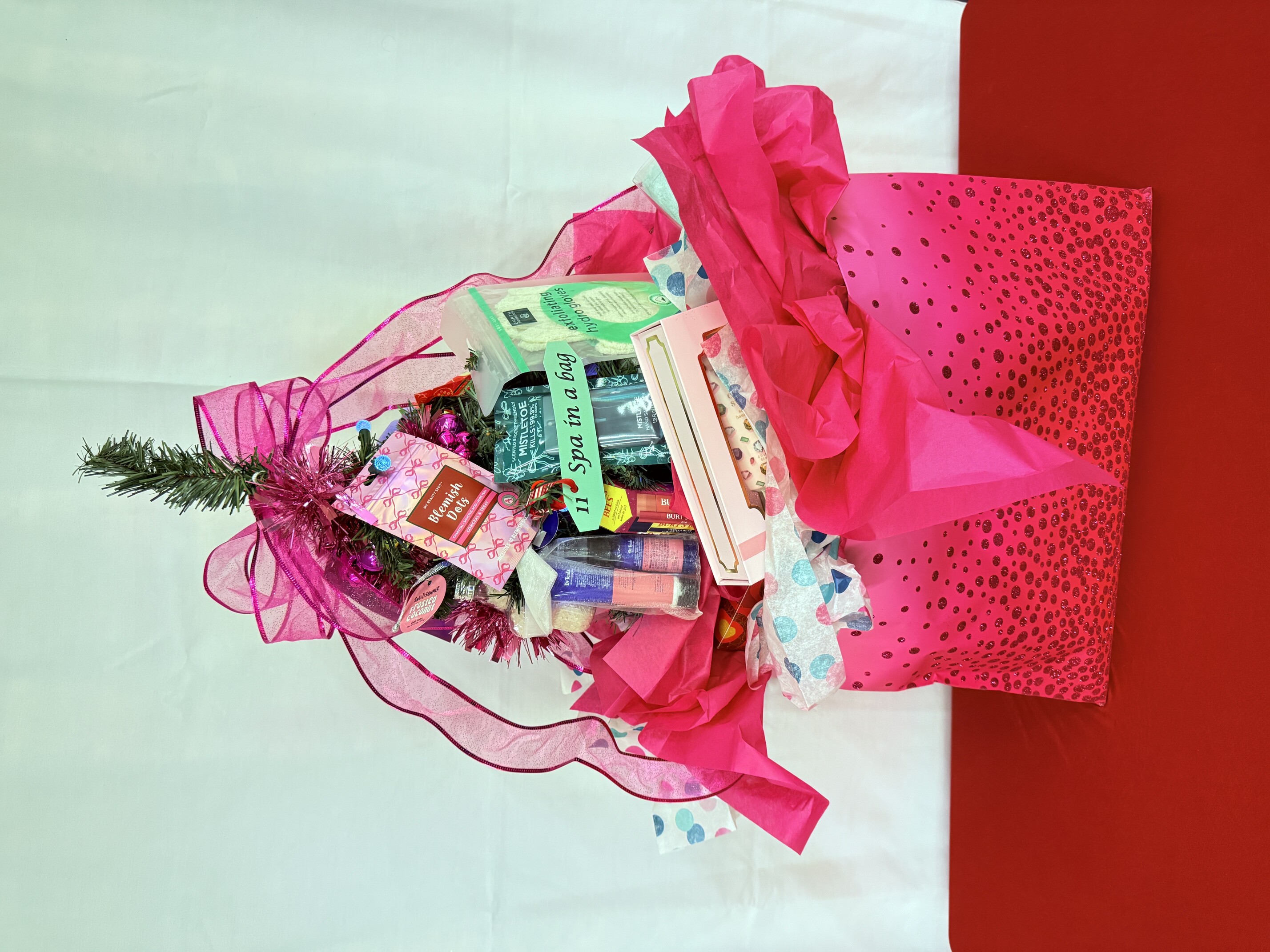Towel warmer and 2 towels, robe, pajamas, slippers, warming wrap, lotions, hand bands, loofah, bath pillow, make-up bag, shower steamer, bath salts, facial masks as well as gift cards for $40.00 for Bath & Body, $25.00 for Lululemon, and $25.00 for ULTA.